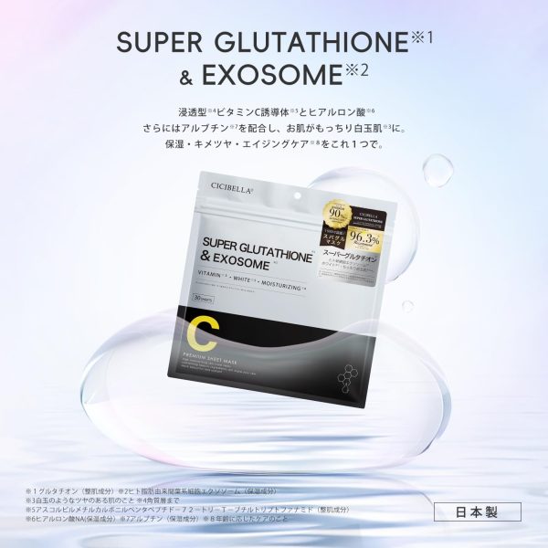 CICIBELLA Glutathione Mask, Made in Japan, Large Capacity, 30 Sheets, Exosome Sheet Mask with Vitamin C and Human Stem Cells, Moisturizing and Elasticating for Sensitive and Dry Skin, Mask Sheet, Serum, Skincare (Super Glutathione x EXOSOME)