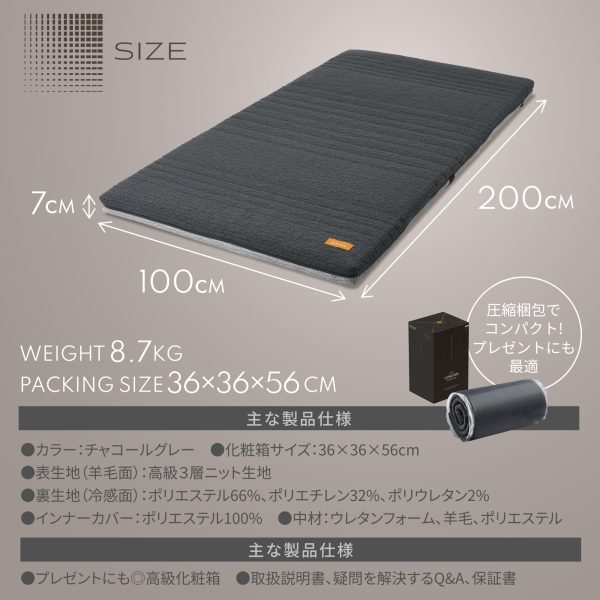 【The GOKUMIN – MASTER SLEEP】A multi-award-winning functional mattress developed by GOKUMIN’s sleep specialists. Experience a high-functionality mattress that offers year-round temperature comfort and excellent body pressure distribution. [Product Specifications] ● Size: 100×200×7cm ● Material: Inner material / Urethane foam, wool, polyester, Cover outer fabric / Premium three-layer knit fabric, Cover inner fabric (cool side) / 66% polyester, 32% polyethylene, 2% polyurethane, Inner cover / 100% polyester ● Color: Charcoal Gray ● Product weight: Approximately 8.7kg ● Box size: 36×36×54cm ● Japanese instruction manual ● Luxury gift box ● Antibacterial and deodorizing specifications ● Country of manufacture: Developed by Japanese company / Japanese design / Produced in dedicated Chinese factory