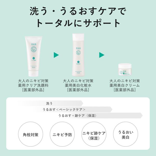 ✅【For Adults Concerned About Acne Prevention】 A skincare series that includes face wash, lotion, cream, serum, and face pack, which simultaneously offers acne prevention, care for acne scars (moisturizing), hydration, brightening care*, and exfoliation. *Helps suppress melanin production to prevent spots and freckles.