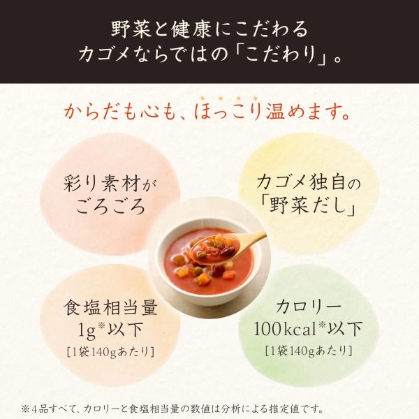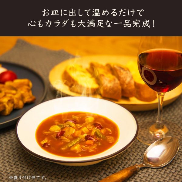 Tomato Minestrone [Ingredients] Vegetables (cabbage (domestic), onions (domestic), potatoes, carrots, green peas, celery), tomato paste, red kidney beans, chicken broth, vegetable broth, mixed vegetable sauté, glucose, soybean oil, cornstarch, dried tomatoes, salt, spices (contains milk, soy, chicken) [Allergens] Milk, soy, chicken [Nutritional Information (per 140g pack)] Energy 66kcal, Protein 2.1g, Fat 1.6g, Carbohydrates 12.1g [Sugars 9.7g, Dietary Fiber 2.4g], Salt Equivalent 0.72g, Potassium 300mg. The values are estimated based on analysis.
