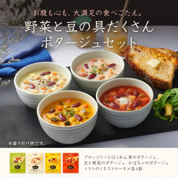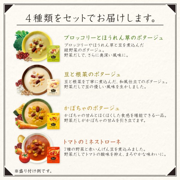 【A Hearty Vegetable and Bean Potage】 This potage soup brings out the sweetness and gentle flavor of vegetables and beans with a unique “vegetable broth.” It offers a convenient and delicious way to enjoy vegetables that are often lacking in diets. It is also suitable for gifts or home stock. Contains 140g × 16 packs per set. Broccoli and Spinach Potage [Ingredients] Vegetables (potatoes (New Zealand), onions, carrots, spinach, green beans), lentils, milk, red kidney beans, chickpeas, broccoli puree, vegetable broth, sugar, fat-adjusted powder, cornstarch, salt, soybean oil, spices (contains wheat, milk, soy) [Allergens] Wheat, milk, soy [Nutritional Information (per 140g pack)] Energy 74kcal, Protein 2.5g, Fat 2.1g, Carbohydrates 12.7g [Sugars 10.0g, Dietary Fiber 2.7g], Salt Equivalent 0.68g, Potassium 190mg. The values are estimated based on analysis.