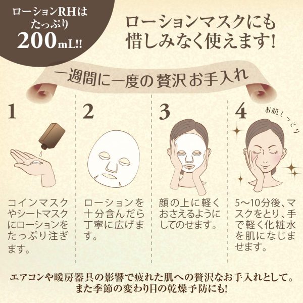 【Generous 200mL】 With a generous 200mL capacity, it is designed to be used lavishly. It can be used as a lotion mask by soaking a coin mask or sheet mask. Ideal for dry skin and as a countermeasure during seasonal changes.